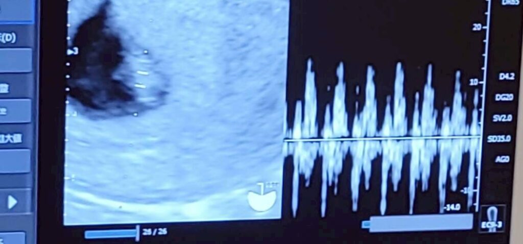 すぐに私の子宮内に見慣れない黒い塊と真ん中に白い影が確認できました!